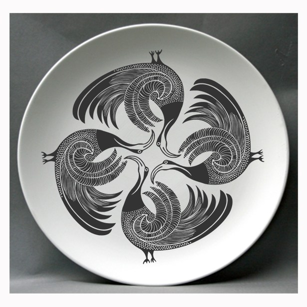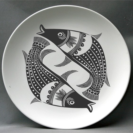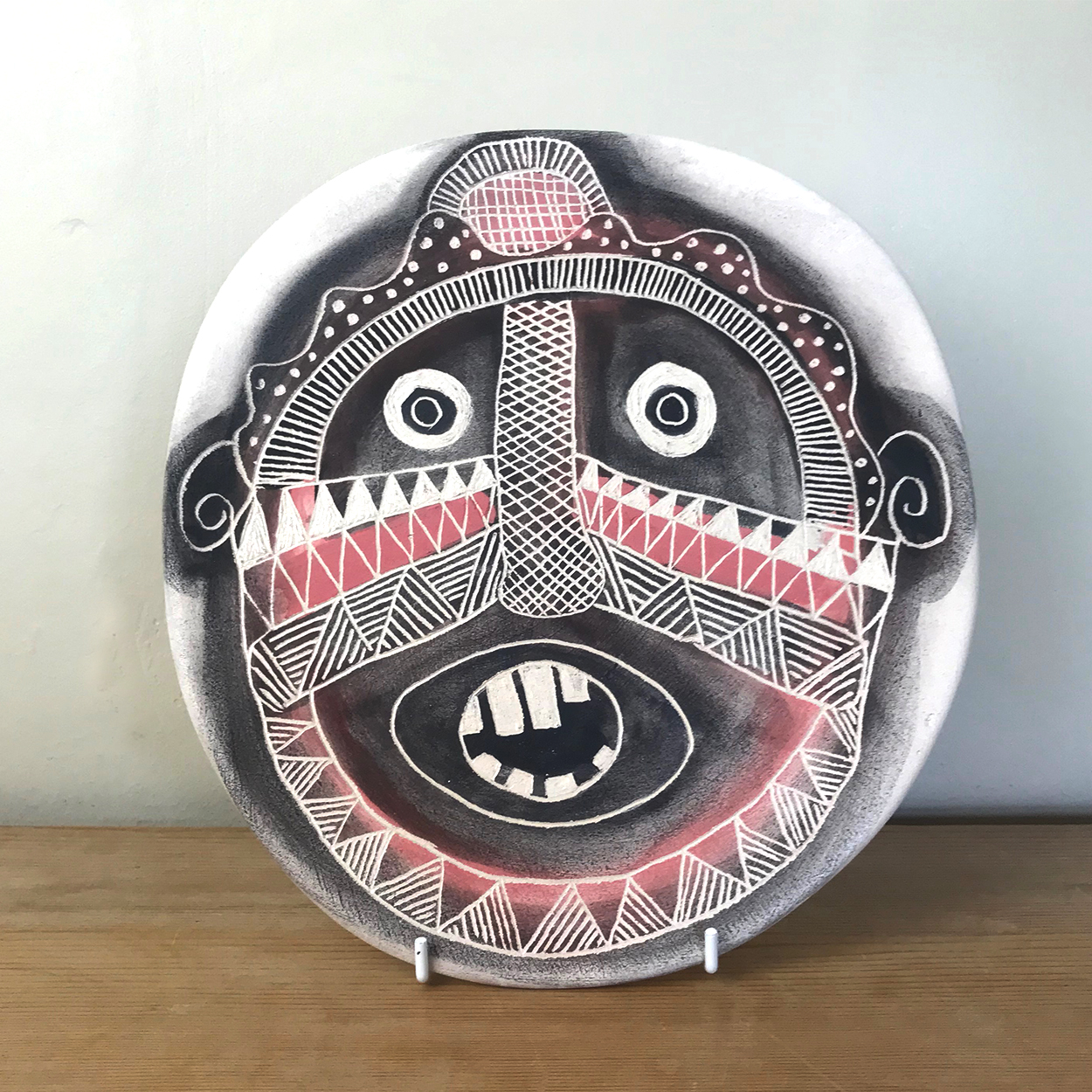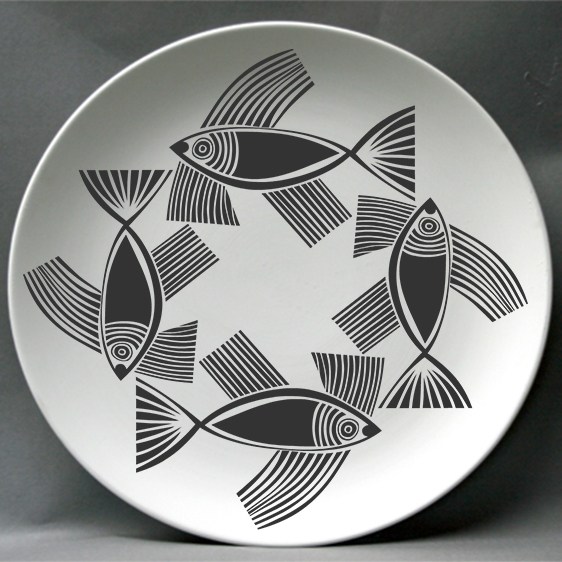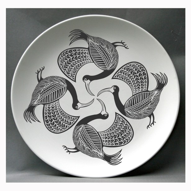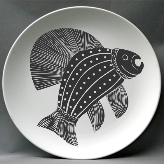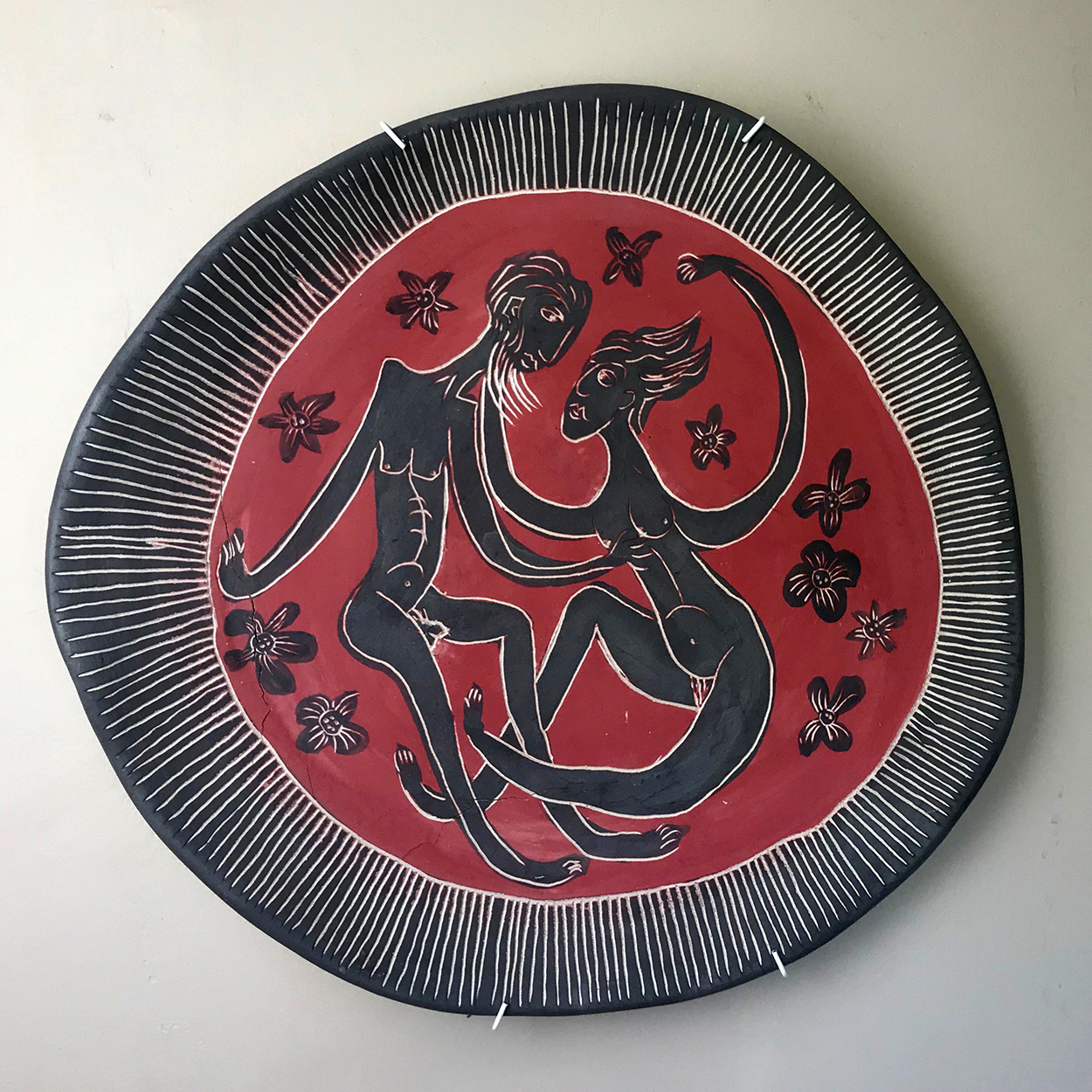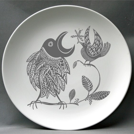 Hand built plates and bowls feature sgraffito illustrations and can be displayed as wall hangings and used as tableware.