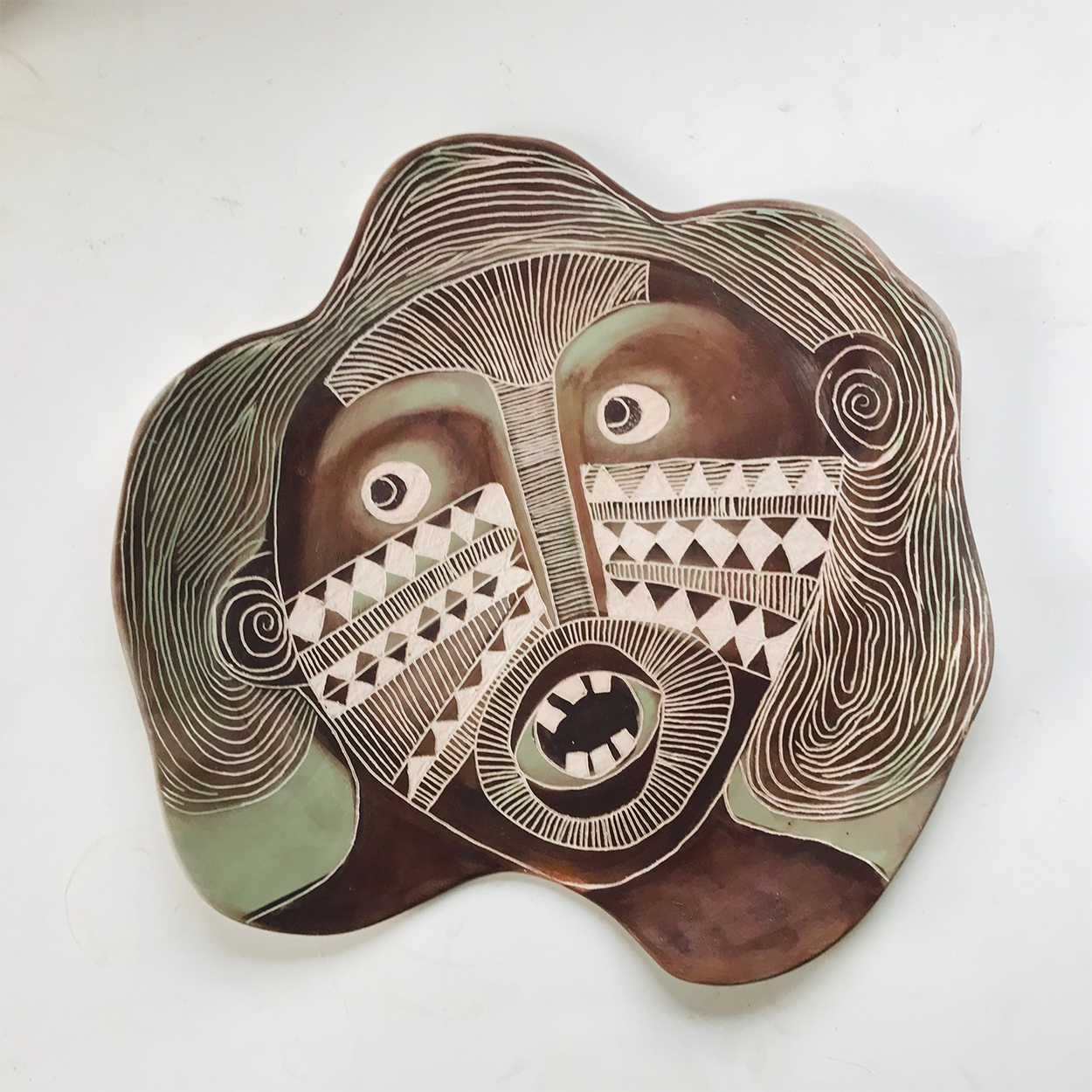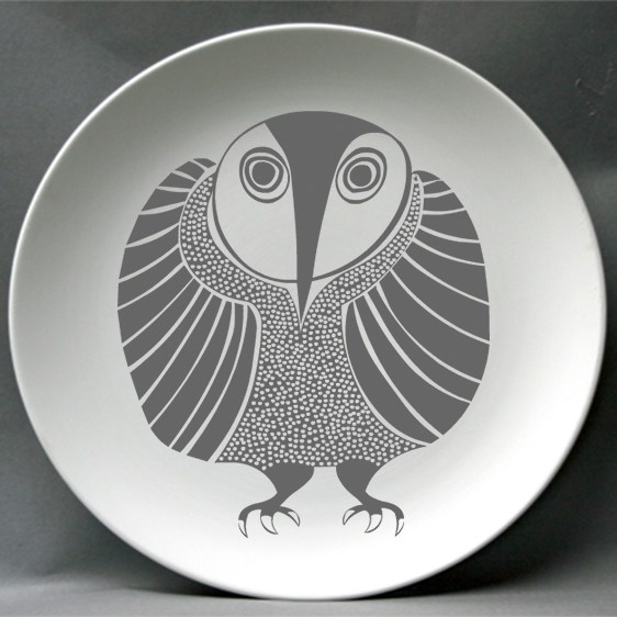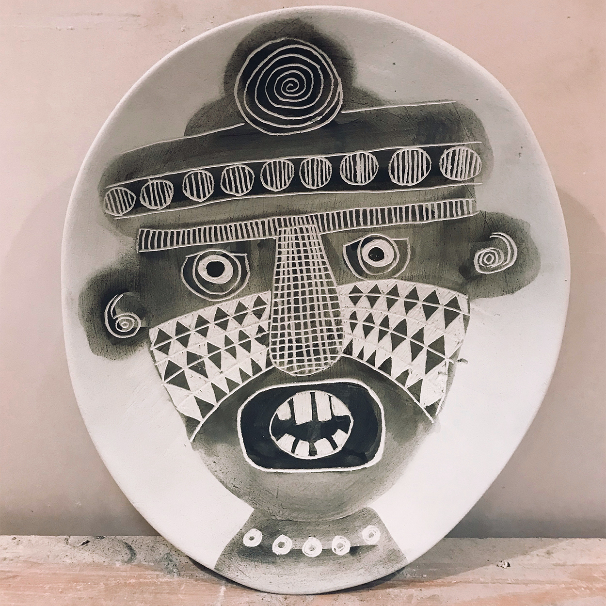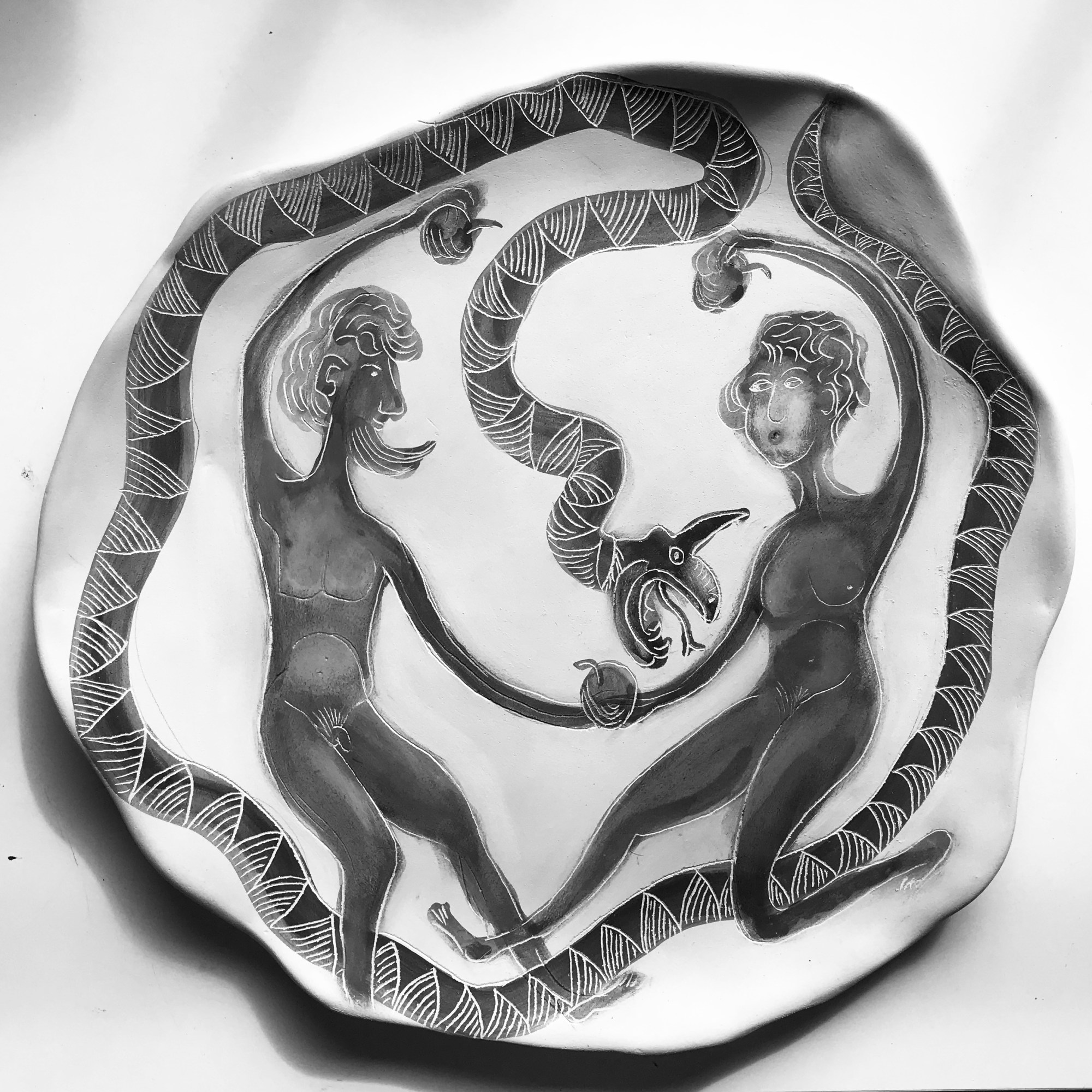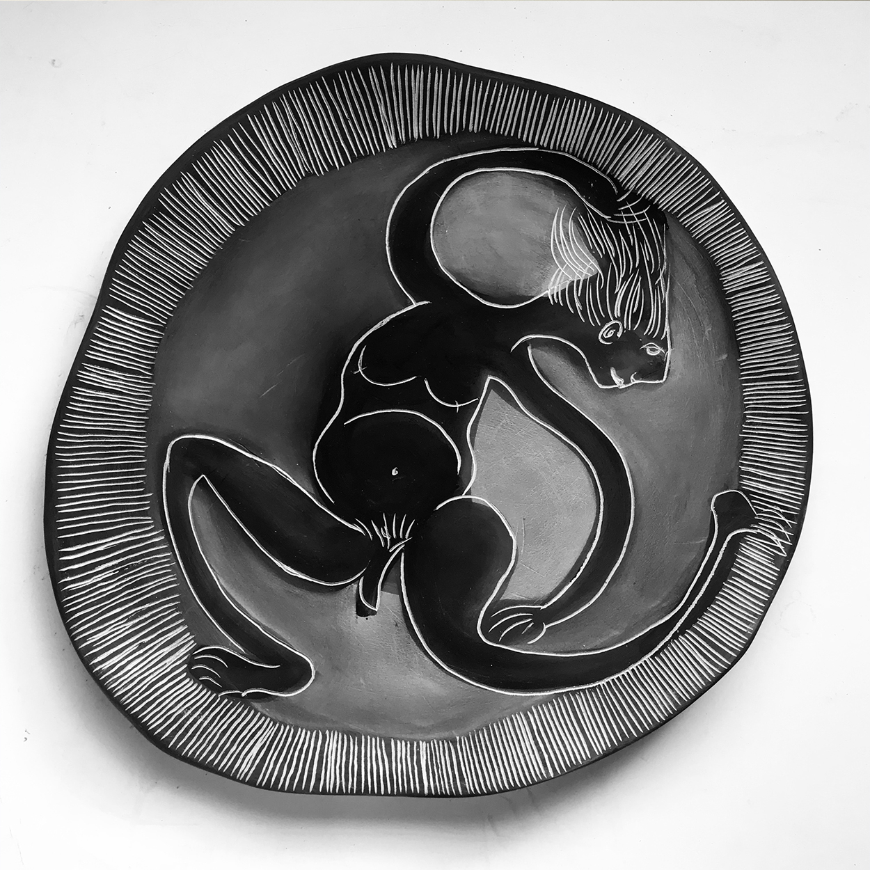 Hand built plates and bowls feature sgraffito illustrations and can be displayed as wall hangings and used as tableware.