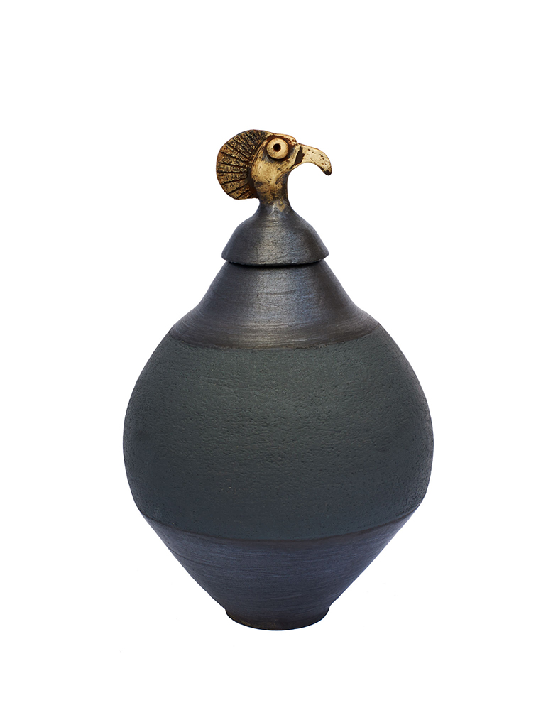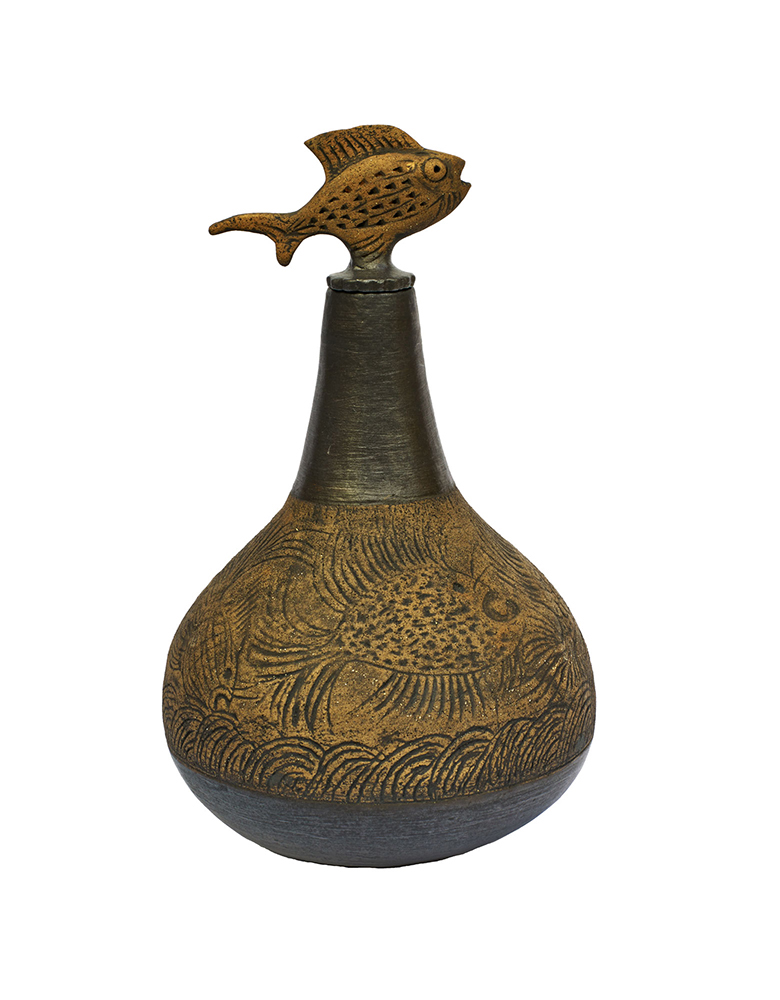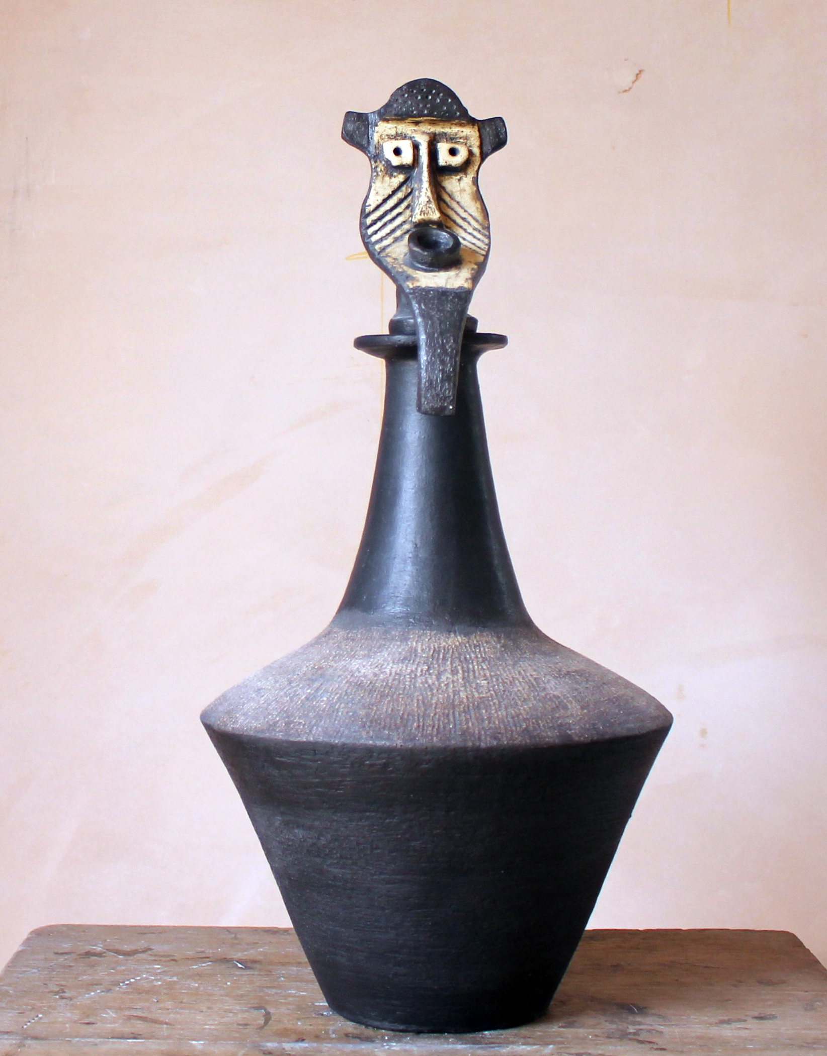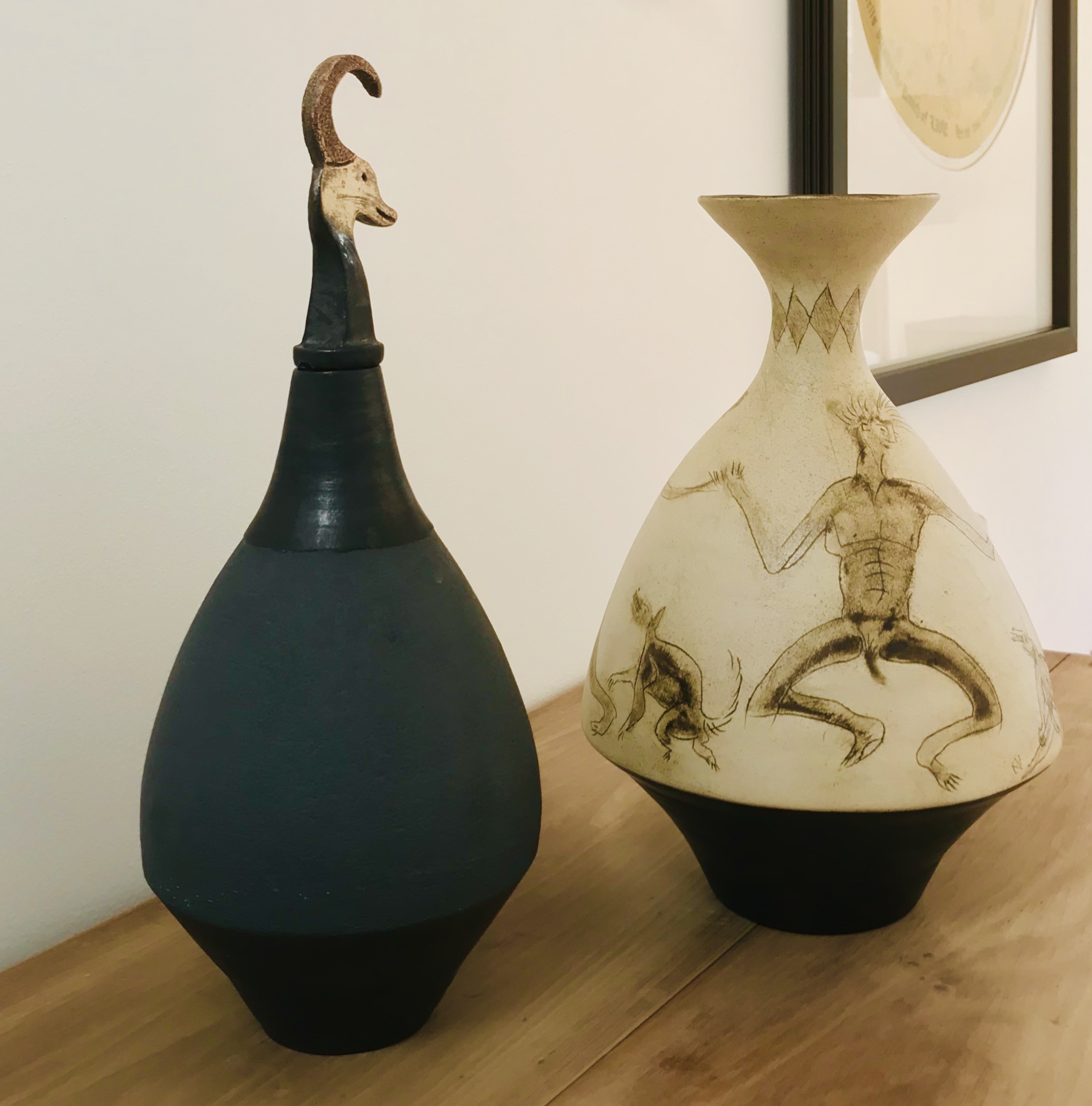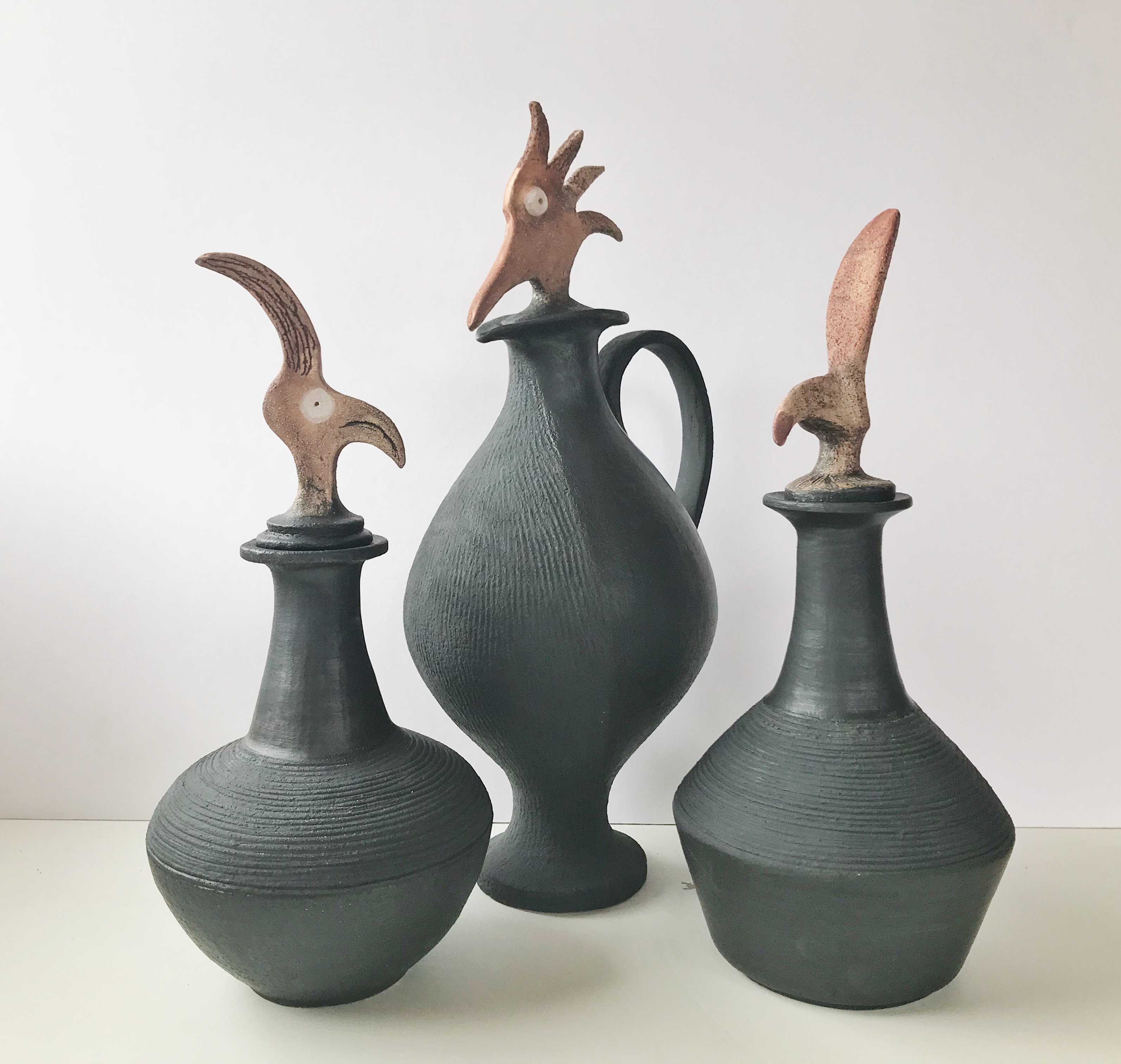 A selection of hand built, unique vessels with distinctive sculpted stoppers, pots, jugs and bowls are both decorative and functional. Stoneware, oxide stains and glazes, with hand painted and sgraffito illustrations.
