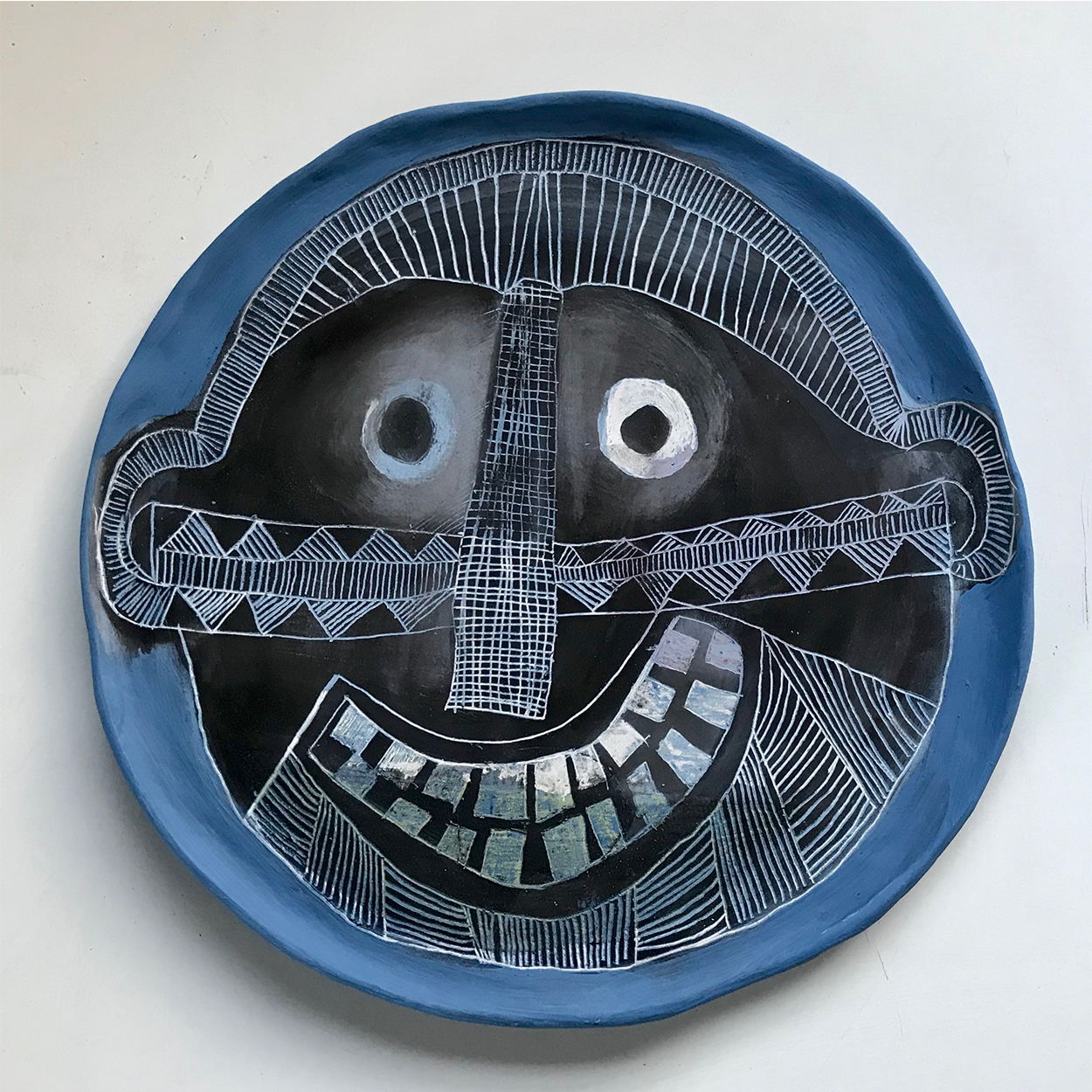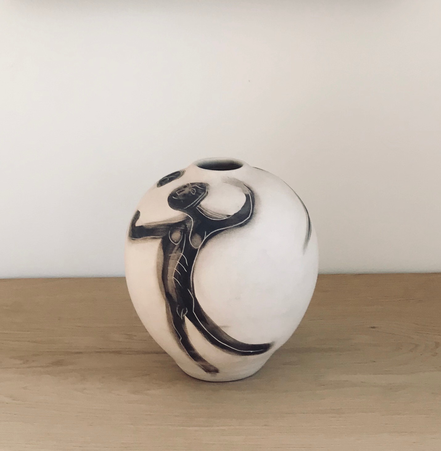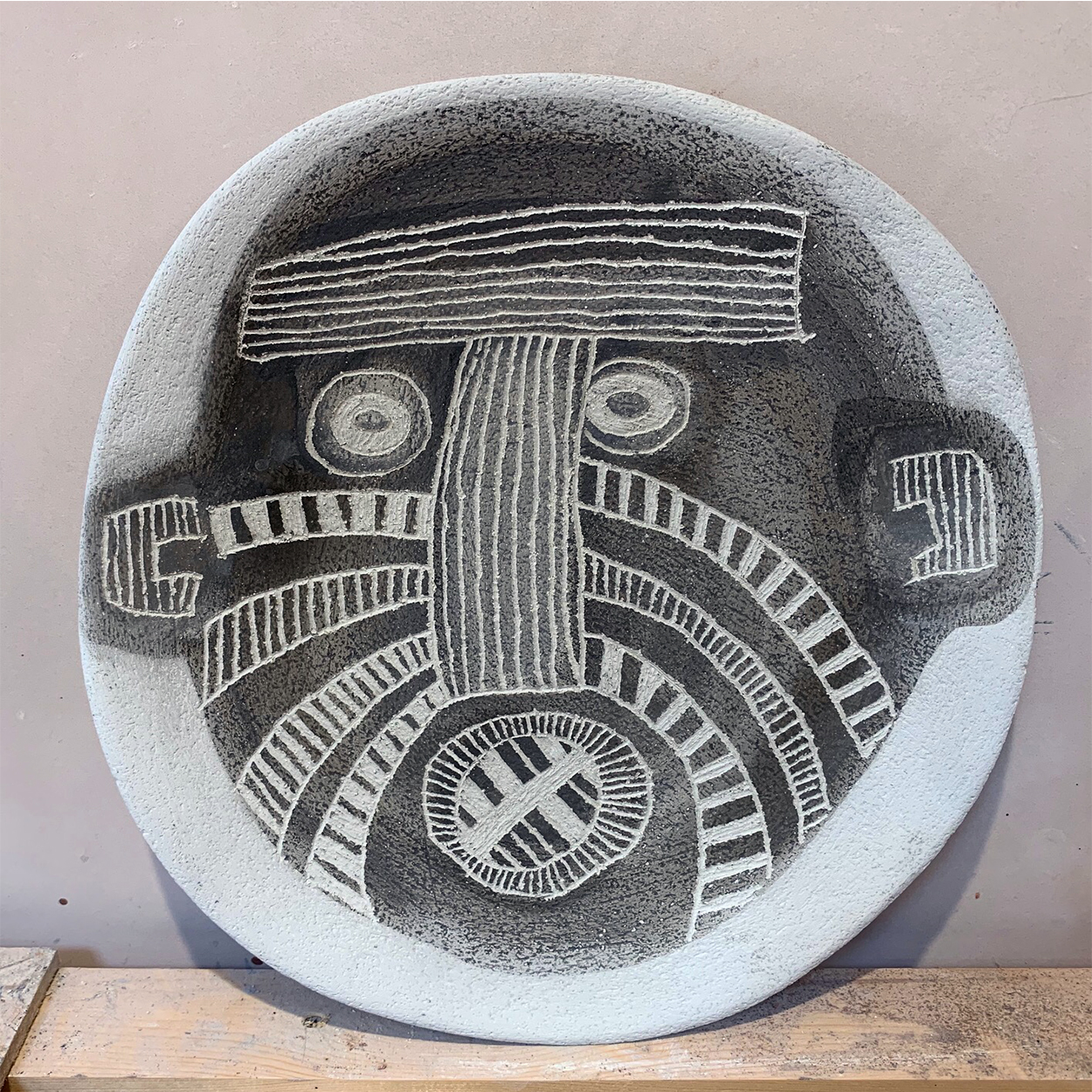 His working practice has developed by using the ancient techniques of the hand built coil vessels, plates and sculptures in stoneware worked to achieve various textures and decorated with natural oxides and glazes. His hand painted and sgraffito graphic illustrations decorate the surfaces. Many of these pieces have been commissioned and form part of private collections around the world.