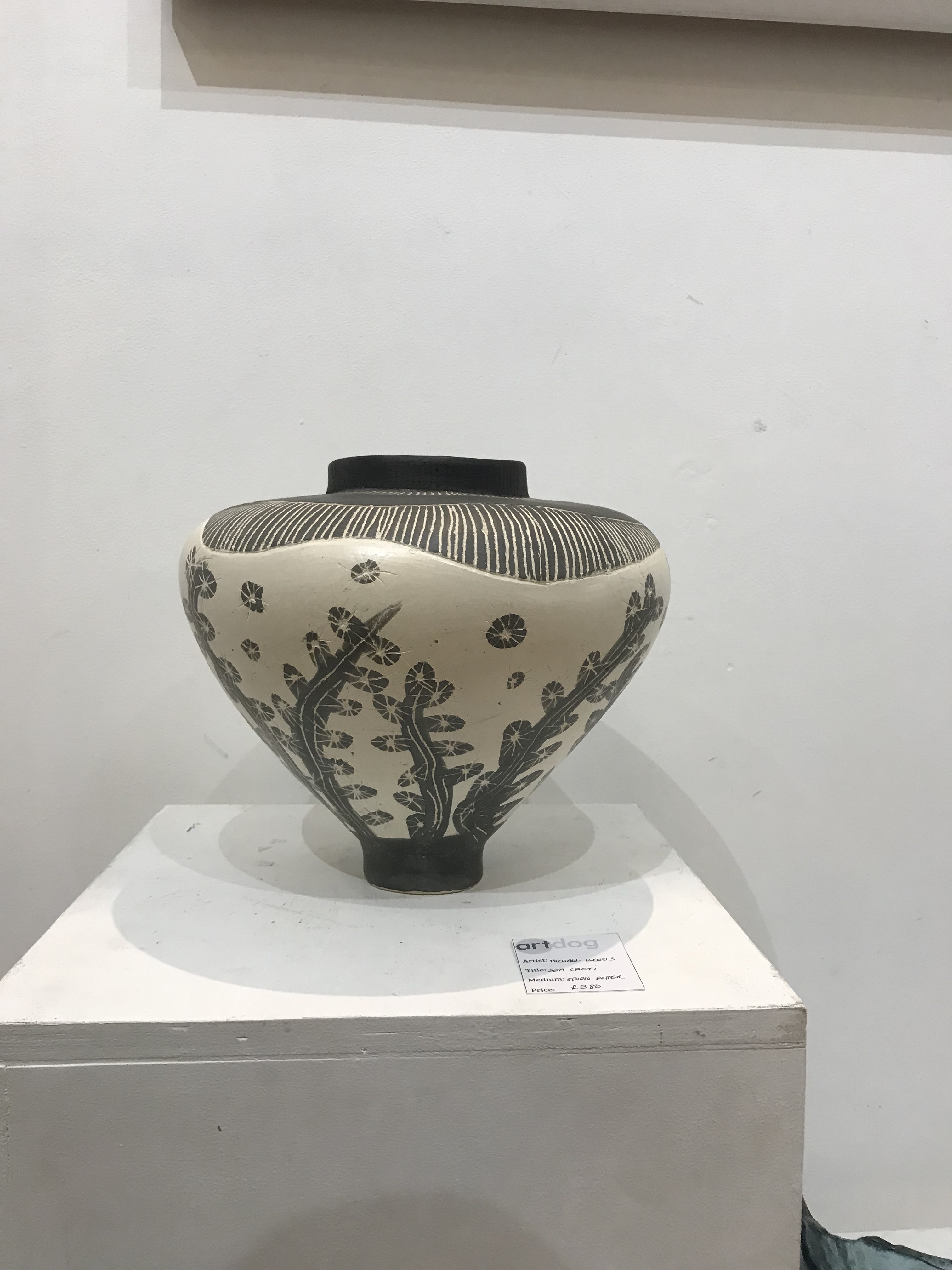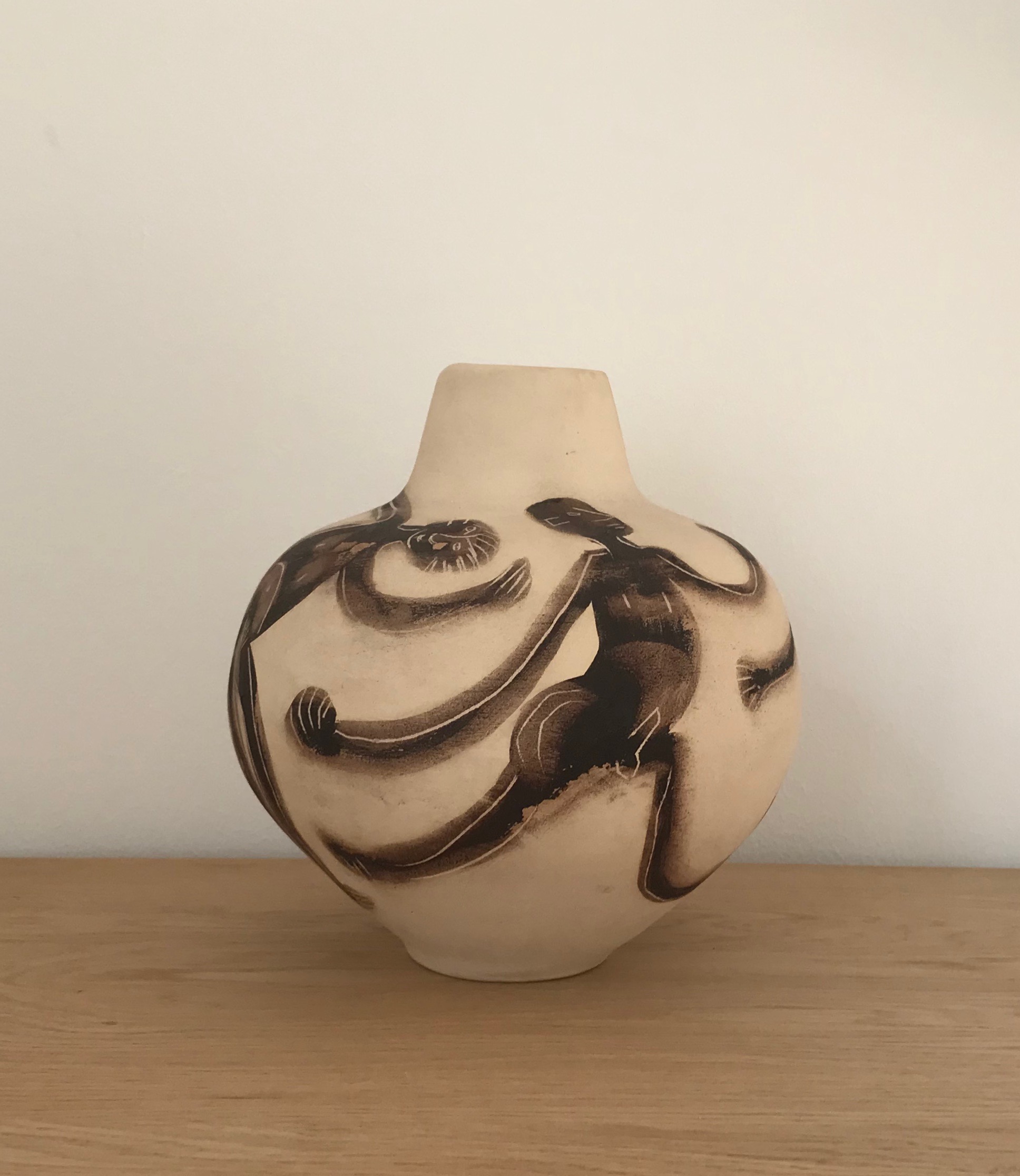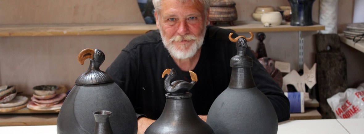 His working practice has developed by using the ancient techniques of the hand built coil vessels, plates and sculptures in stoneware worked to achieve various textures and decorated with natural oxides and glazes. His hand painted and sgraffito graphic illustrations decorate the surfaces. Many of these pieces have been commissioned and form part of private collections around the world.